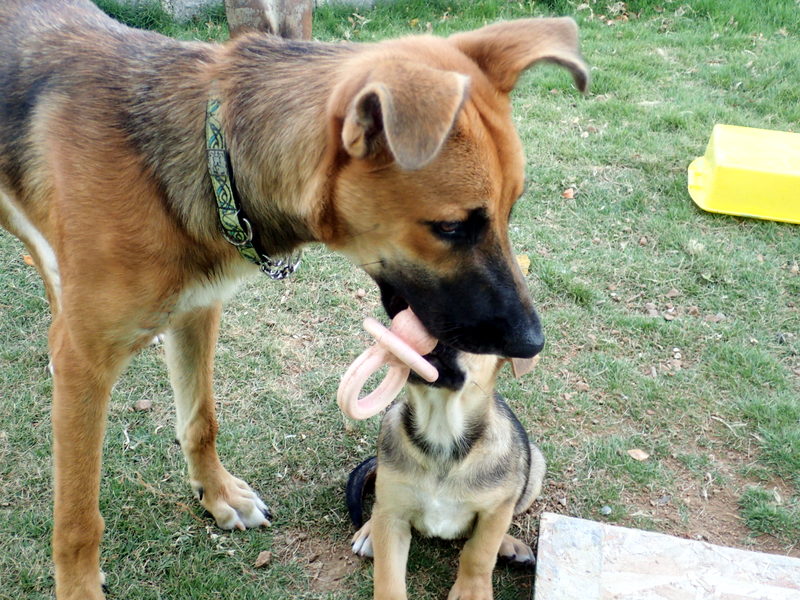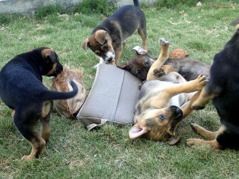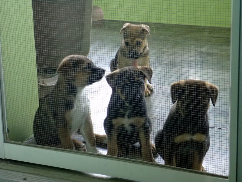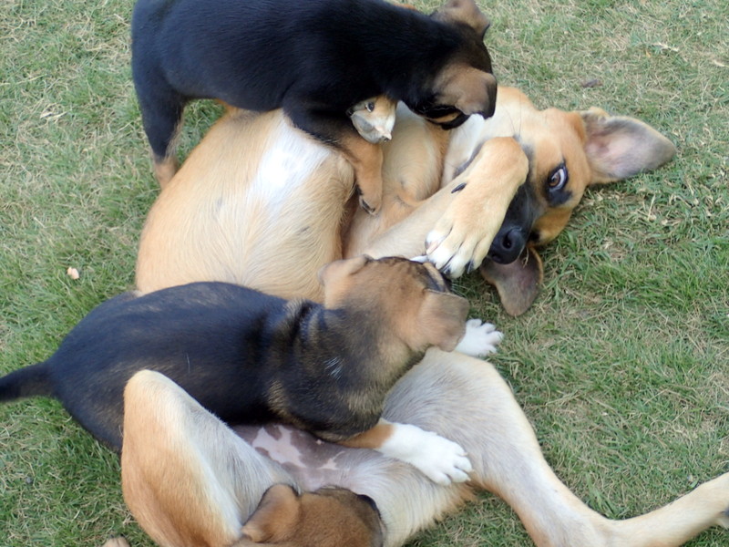 That brings us to the 4 at home. One we are keeping for sure and the others we hope to find homes for. They are still young so there is no huge hurry, except for the fact I get more and more attached everyday. We still have my boy Barrio, Tank, Brindle and Max. They are wild and crazy puppies and they are madly in love with Lola. We are trying to wean them from Frito and to do this we have to keep her out front away from them, otherwise her milk will never dry up. Hell, she’s almost dragging on the ground, of course I probably would be too if I crawled on all 4’s. She only comes around if she thinks there is food for her. The other day she snuck in the house, came upstairs looking for cat food and instead found a bag of dog treats in the pantry on the shelf in a ziploc bag. She managed to drag the bag off of the shelf and a jar of salsa came with it, obviously smashing to smithereens once it hit the concrete floor, I do not know if she licked the salsa up, glass and all, or not, Bill cleaned it up while I was downstairs attending to puppy bedlam. She is obsessed and it’s getting obnoxious. She has been wormed and her poops aren’t worm infested, I think it’s her street beggar mentality shining through.