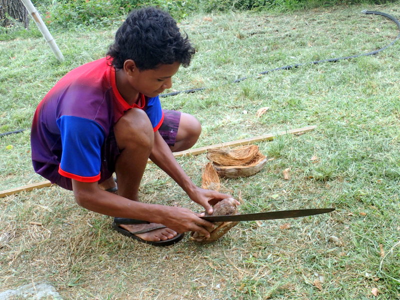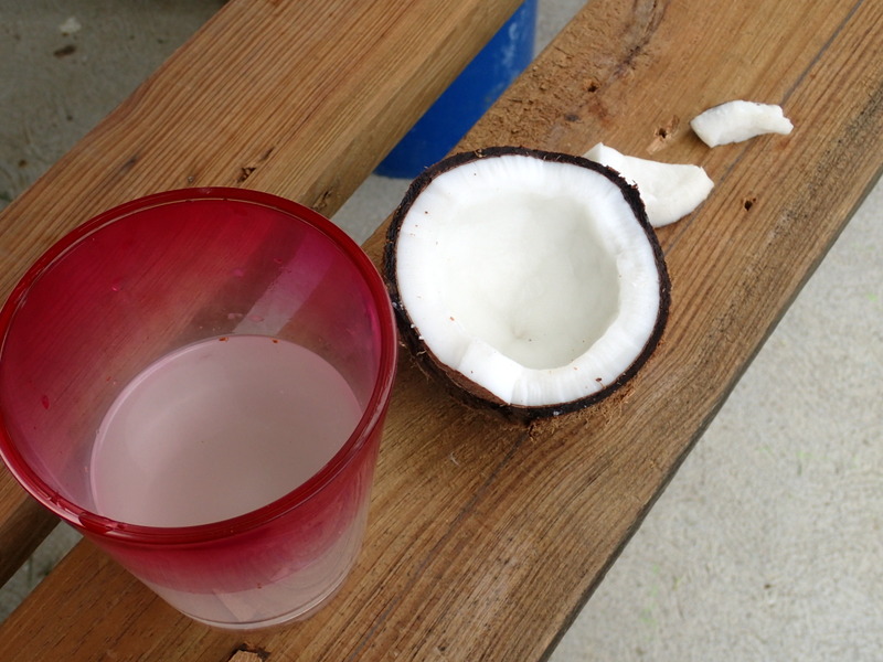 My nap was short, as usual, the damn dogs were barking because Eddy came up to see what was going on. His 3 brothers were hitch-hiking home from school today, Arbor Day celebration and Bill gave them a ride here so I could measure them for TOMS shoes. They did not get any when we were at their school. It’s weird, they have to hitch a ride to school because it’s so far away, if they don’t get a ride in time, they go home. Sad. These boys are 6, 8 and 9. They hitch hike to school. Alexi was here for the day helping do stuff so they cut up some coconuts from our tree. I wanted to see if the pups liked the fresh coconut milk and oh yes they do!! They drank it all. I then broke some small pieces of coconut meat up and they ate that too. This will be part of their new diet for sure, can’t be anything wrong with them eating this, fresh from the tree.