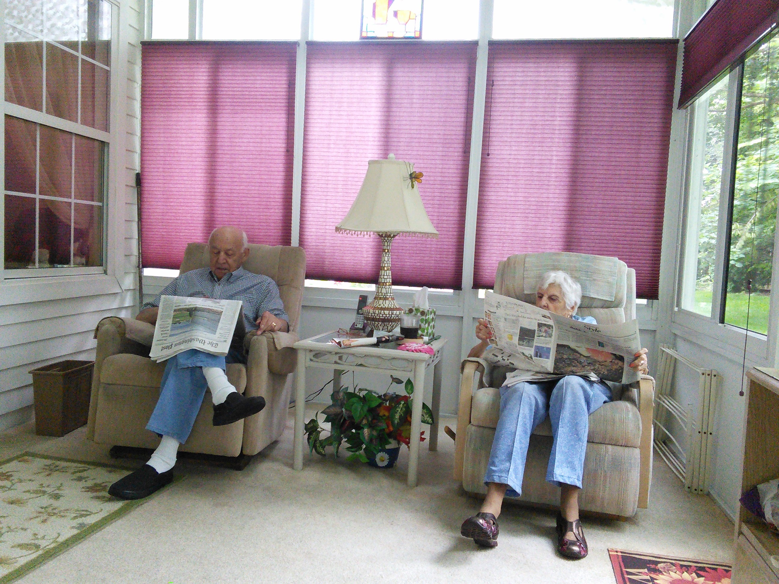 It was great seeing my parents and I feel so fortunate that we all still have them in our lives. At the rate they’re going, they will be with us for awhile. Both of them are in good health, Dad’s memory is foggy at times but hell, he’s 94. Mom can remember pretty much everything so I have to give her credit for that. Dad still swims 3 times a week at the center but they don’t go out much. They really enjoy their back porch and spend most of the day there, weather permitting. They read but mostly snooze out there. Can’t say that I blame them, it’s a great napping porch.