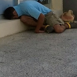 We were driving past the grocery store the other day and saw this dude crashed on the sidewalk of the bank.
