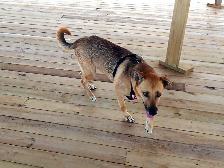 I finally found a home for him on the beach in an amazing location with my friends G and Robert. They had tied him out one day and they went golfing. He had never been tied so he chewed through the rope and ran away. When I found out he was gone I said, “we’re on our way.” I was frantic, wondering where Tank was, if he was hurt, caught in barbed wire, I was a nervous wreck. Bill and I drove around for 90 minutes looking for him, no sign of him at all. We came home depressed and just sick to our stomachs. Twenty minutes after we got home G messaged me that he was back. Relief filled my heart. Now he has figured out that he needs to stay home. They went golfing and left him home. He was on the porch sleeping when they returned. I think he will really bond with G because she runs 3 miles every morning and she takes him with her, he loves it. I’m so happy he has a good home.