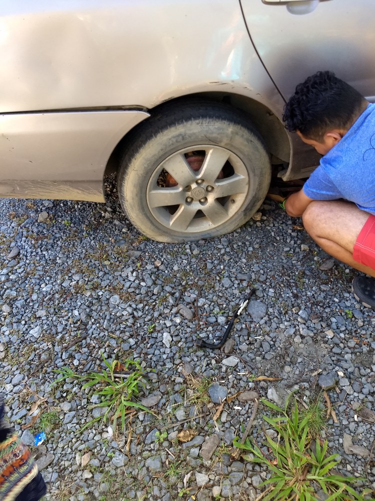 After my appointment we walked back to Lily’s car and she had a flat tire. Of course she did, this was my comedy of errors day. We walked out of the parking lot and were approached by this boy and his father.