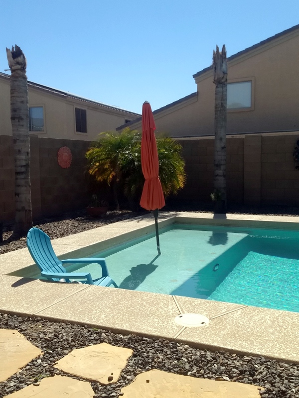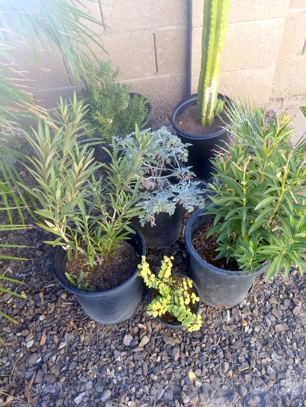 We went to the Avocado Nursery and bought plants, a Mediterranean Palm, another kind of palm, 2 rosemary, 2 oleanders, 2 artemesias, 3 ground covers and a really cool pillar cactus. We had a crew come in and cut down the 3 dead Queen Palms, They chopped them up and hauled them away. They also dug the old stone out from between the patio and the pool. Then we ordered 6 tons of Arizona Gold stones and had them redo between pool and patio and spread new stone on the whole rest of the yard. It looks so much better. They also planted all 13 of the new plants. I decided I needed succulents so I went to Lowes and bought way too many and another terracotta planter. They’re all planted and growing well.