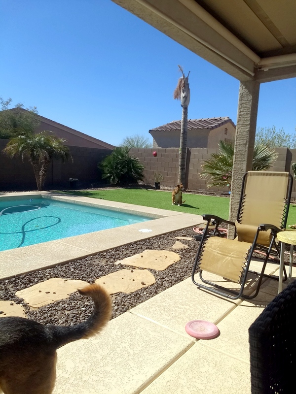 Today I cleaned the dog hair out of the cracks on the back patio then hosed the patio off. I’ll tell you, this is a dirty place to live. The air is so dusty that things are covered in dirt 2 days after you clean them. I also vacuumed the yard because there was so much dog hair from bathing the dogs that it looked gross. My vac is torn apart, drying in the sun. It will be clean until I use it once, then it will be filthy again. This is serious dirt, like living in a dustbowl. It’s getting hot quickly, we’re going to need to walk the dogs earlier now, getting too hot for them at 8:30 AM. Actually, I look forward to the heat of the summer when I walk them in the dark, kind of nice to be out before others are even awake. I was never much of a super early riser bit if it means the dogs get to walk, then early rising it will be.
