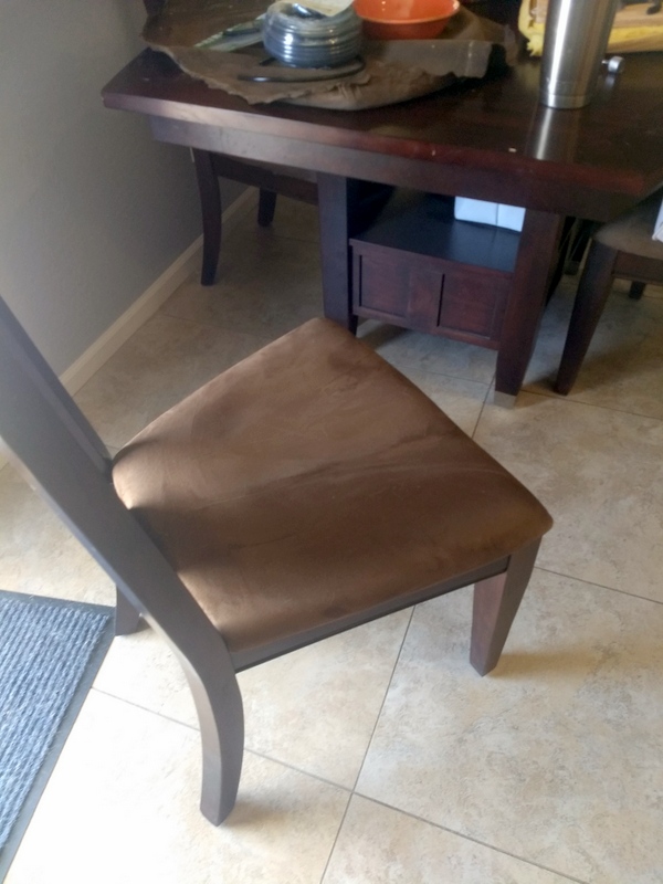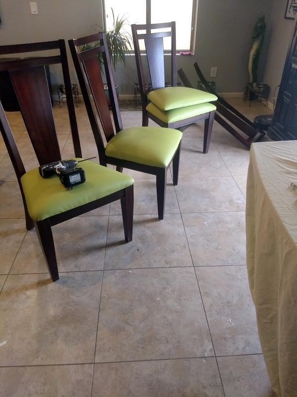 I got the brilliant idea to recover all 6 of the dining room chairs. Sitting on them was like sitting on a wooden bench. I went to Joann’s and found some green pleather material, it’s pretty much the same color as our island house. I figured it wouldn’t attract dog hair and wet swimsuits weren’t a big deal. I bought it and came home. Then we decided we needed new foam, well, we kind of knew it, but I wasn’t in a foam shopping mood. I ordered a 2″ foam mattress pad from WalMart. It, of course, was delayed. The pad finally came and was just big enough to do all 6 chairs. We got 3 chairs finished and decided we needed some dacron or whatever it is they cover all the staples on the bottoms of chairs with. Back to Joann’s.