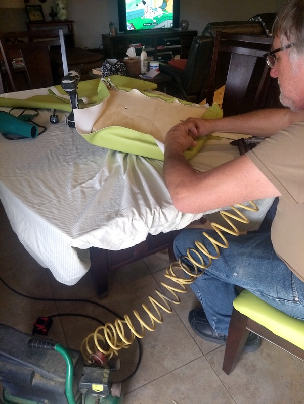 I got the dacron stapled on the back then Bill realized he failed to drill holes in the wood so the air could escape. Not too big of a deal, He took care of that.