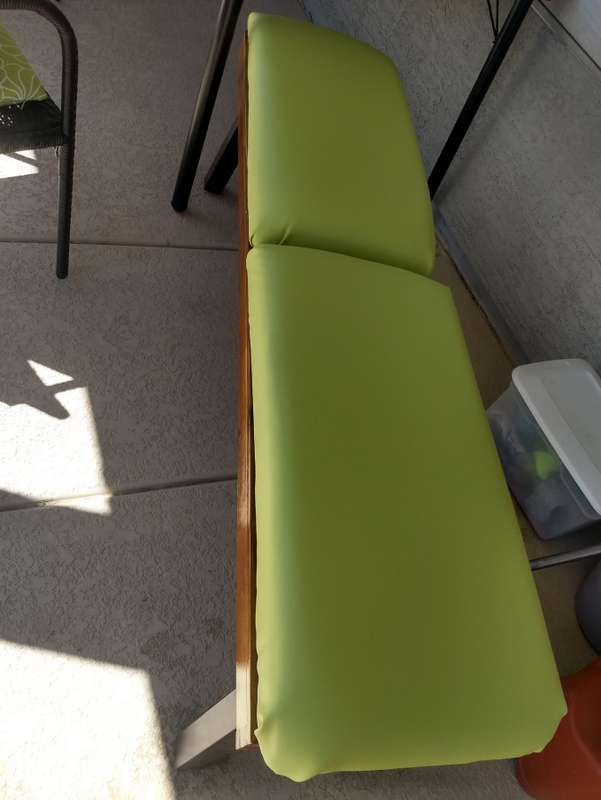 Let me say, the first chair was easy. We did a good job on it. From then on out it was curse city, calling the stapler and the material that didn’t form around a corner nasty names. The second and third chairs were not easy. We saved the last 3 for the next day. We swore while doing them too. THEN, we had so much green material left, I suggested we make a nice big pad for the wooden outdoor bench. It’s really too low to sit and eat at the table, well, unless you’re Michael Jordan. I drove back to Joann’s and bought the foam, 3″ thick. I almost had a stroke when they said how much it was. Thankfully it was 40% off but it was still expensive for foam. Bill cut the wood for the bottom (he cut all new bottoms for the chairs also) and we did the bench in 2 sections, otherwise, we didn’t have enough material for the whole bench. The 3″ foam is very hard to work with, especially when you have no skills and are using a non-compliant material. We got it done and while it’s not perfect, it’s really comfy.