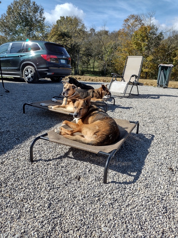 On Tuesday morning I decided I would walk them up to the powerline hill, then, we would walk to the other place where we usually go. We were all on top of the hill, they were sniffing around, Gringo caught the scent of something and took off running down the steep hill. Highway Barrio and Max followed. I started yelling for them and was trying to climb down the bank to see where they went but I couldn’t see them. After yelling for a few minutes Highway, Barrio and Gringo came back. No Max. Max ALWAYS comes when I call him. He didn’t this time. I freaked and called Bill. He said, “Oh shit, a coyote just ran through the field from up that way.” I was screaming (probably like a banshee) for Max, nothing. I took the other 3 down to Walt and put them in their crates and hiked back up the hill. Bill was walking through the field and climbing up the hill. No Max. By now I was in full panic mode. I went down that steep mountain screaming for Max, no Max, no barks, nothing. Bill hiked up the side of the mountain and came back down, still no sign of Max. I called our neighbor and told him, he got on his ATV and went looking. I got in the car and drove up and down the main road. No Max. I came back to the RV, got Gringo and we hiked up the mountain again. We kind of traversed it, it’s so steep and there are way too many trees, it’s hard to walk. There are downed trees, briars and thick brush. I fell once on my butt on the side of the hill. At this point Bill was in the car again looking on the main road. Gringo and I made it down the hill, coming out of the woods I was so exhausted I could barely lift my feet, I tripped and fell flat on my face. Gringo was freaked out and came over and was nosing at me and barking. Once I got up, we followed the woods alongside the field. We were almost back to the RV when I saw fur by the RV. Then Gringo took off running to Walt. MAX WAS BACK!! I called Bill right away. Max was gone over 1 and 1/2 hours. He’s never done that before. He wasn’t hurt, wasn’t covered with briars, no clue where he was. I washed his feet and put him inside, cleaned the other 3 dogs’ feet and we all went inside and snuggled on the bed. Max kind of flopped on me, like he was saying, I’m so glad I found you. Bill and I were on the verge of a breakdown. Having something happen to Max would be more than I could bear. If he could only talk.