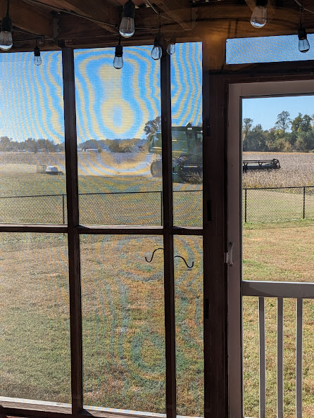 One of the things I liked about this house was the fact that there were no houses behind my yard, it was just fields. I never gave much thought about the fields, until one day a week or so ago. I was in the yard on my chaise, the dogs had their cots out there and we were chilling in the sun. I kept hearing a noise but didn’t give it much thought until it got closer. Damn. They were cutting the fields and producing a huge haze of dust. I schlepped everything inside and got the boys in too, just in time. It was dust and tiny particles of the crop that had been previously planted everywhere.