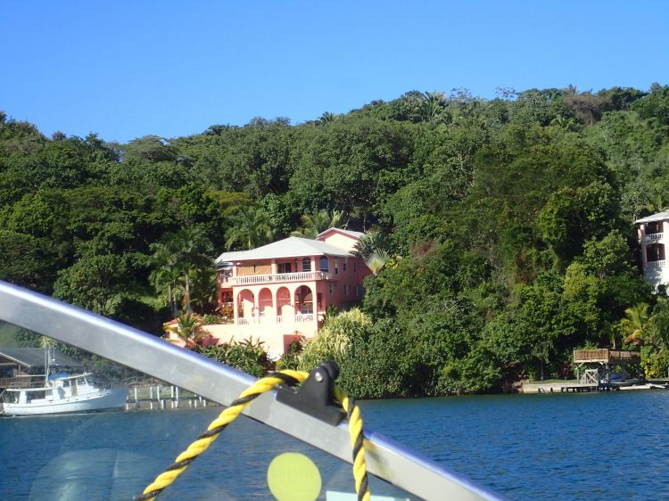 The next day I went to my friend Marcia’s to go cruising in her gorgeous new boat. Marcia was learning to drive it so her boat guy, Christian, was with us. We left Carib Bight, headed out to the east. The boat started acting funny when we turned to go left. After a few minutes it stopped moving. Marcia was unable to get it out of neutral. We were at the mouth of Blue Rock, just bobbing along in the sea. Marcia called her boat repair guy and he said he would be coming right away. It sure didn’t take him long to arrive. He crawled onto our boat, took the cover off the engine and saw that the rubber ring on the prop was rotted and the prop wasn’t engaging. At least, that was my take on the situation, boat mechanic I’m not. He towed us to Trico and went to find a prop that would work on the boat.