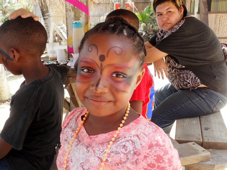 Saturday we celebrated Dia Del Nino, Day of the Children, in Flowers Bay. I took our 3 neighbor boys. I have talked about Eddy before, these are his brothers/step brothers who live with their grandparents. All of the boys living there have been deserted by their parents, who have gone off to find better lives for themselves, not caring about the children they have left behind. The boys I took never get to do anything fun, they have never been to the other end of the island. I made sandwiches for them and took water, sprite and chips. The 3 of them were strapped into seat belts in the backseat and were super quiet the whole way there. They had no idea what to expect, parties are not something they go to. Marcos, the oldest, doesn’t swim but Milton and David sure do. The party was on the water and Marcos asked if they could go in, I said sure.