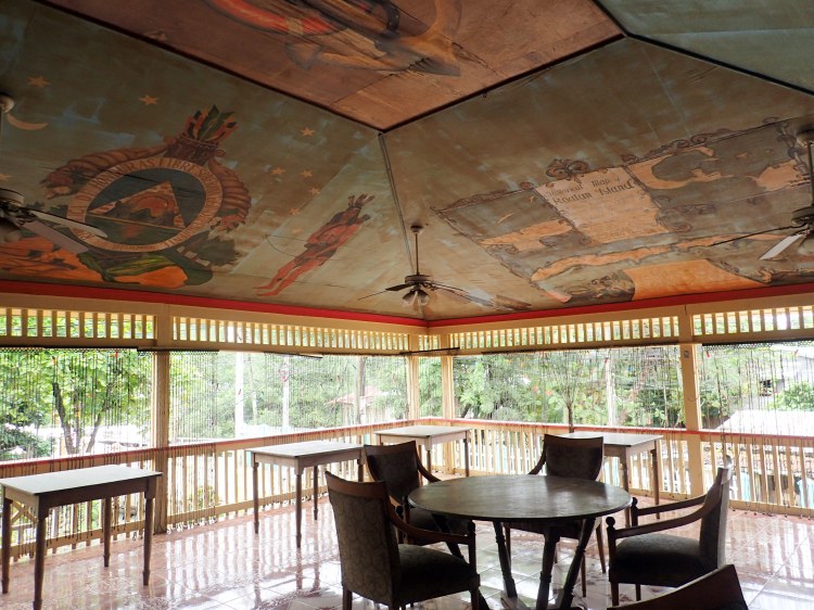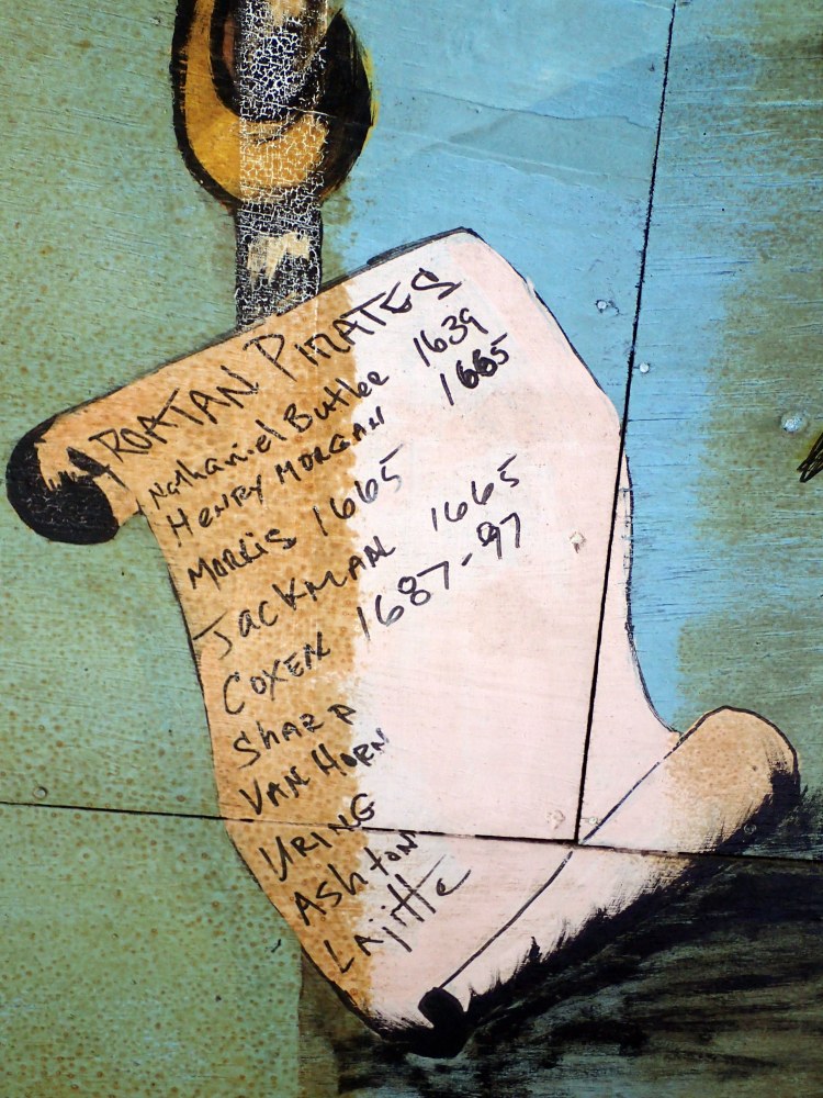 At one time this was a well known and busy establishment. They are still open, random hours though.The inside was a museum, the artwork was amazing. I couldn’t believe it. It saddens me that it is being destroyed by the elements. It really should be preserved.The Pirate history of Roatan was painted on some of the walls. I met the lady whose uncle did the artwork, he has since passed.There were 2 cruise ships painted on the walls, fantastic details on them.Roatan has a huge pirate history.The bar had all kinds of fish painted on it.Don’t know what the hell this fish is but I don’t want to meet it.These were some homes along the building. The far one has an outside sink, which is very common.There was a cruise ship in port that day