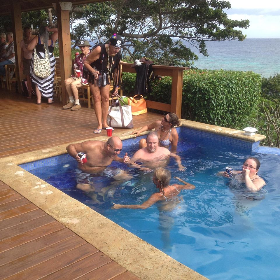 The pool at Big Rock.Badass Marilyn getting her maniThe outdoor kitchen at Big Rock, Francie and JeanieThe man of the hour, grating nutmeg for our Pussers Pain Killer drinks!This woman makes me do bad things. She looks all innocent and shit, but she is NOT…Our drinksAnother pool viewTurquoise toesA massage with a view..wish my ribs weren’t so sore, I would have loved this!Their new baby Rocky. I was in love..Francie’s slutty Pirate toesThe view from the steps going down to the boat.Darkness was descending upon us..Pudens bringing Marilyn’s boat around for usBig RockI love this badass womanBig Rock sits up on the hill above the beach.Through the mangroves and back to BJ’s