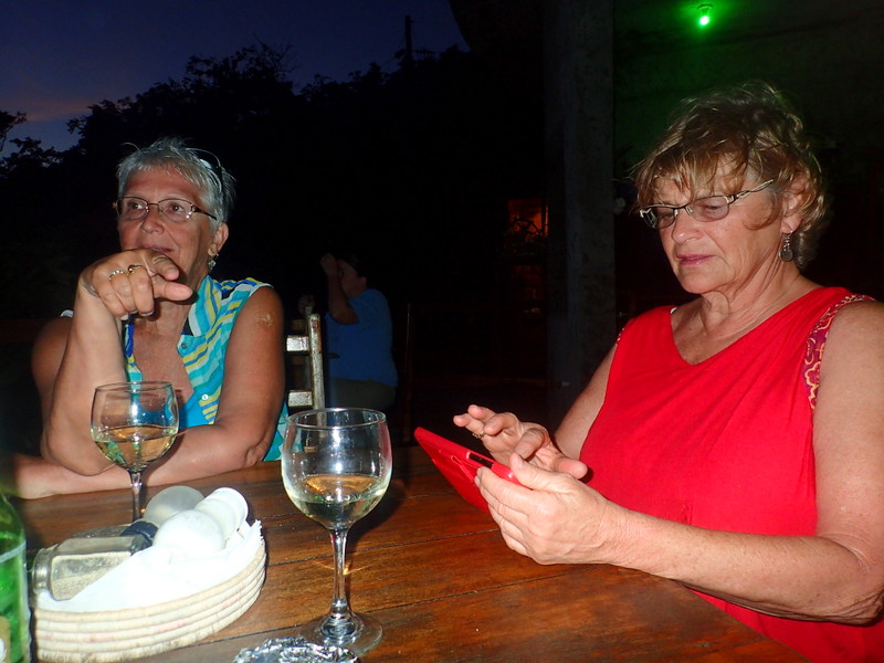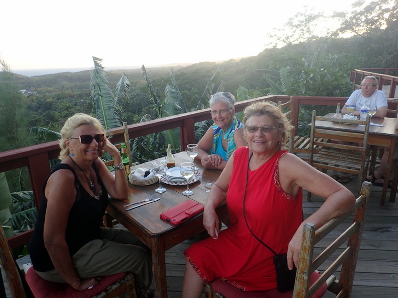 I left downtown Coxen Hole at 11:15, buzzed by the house, Bill gave me a cup of ice water and my books for Spanish class and I drove like the local taxis do so I could get to class on time. It had rained a little while we were marching so I was semi wet, semi sweaty and really needed wine. I made it through my fun Spanish class taught by Francie and immediately headed to BJ’s with the gang afterwards. Luckily I got there before Jeanie and got the biggest wine glass.. Bitchacha!!