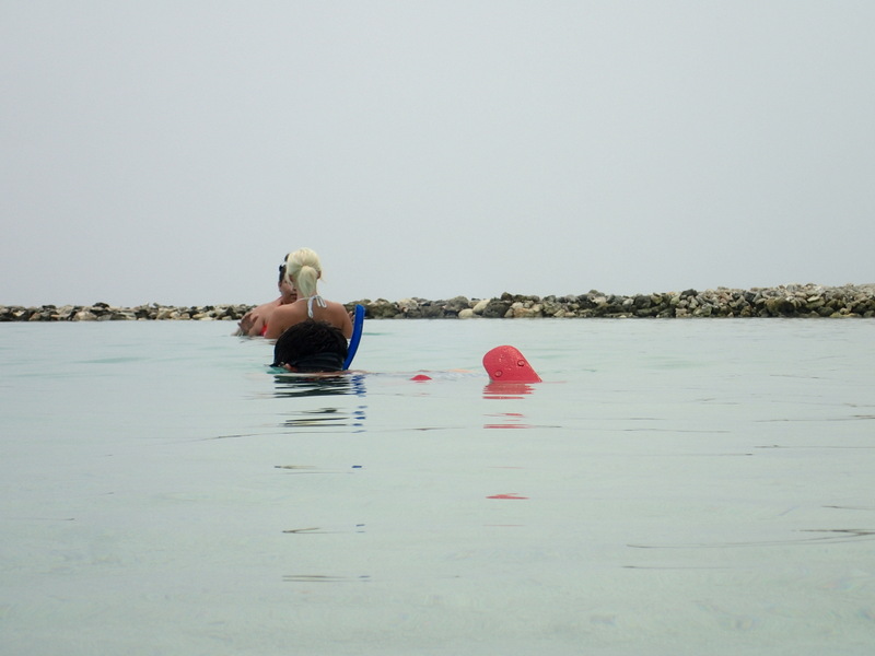Sunday morning we were all awake bright and early for another day of adventure on the Radical Catamaran EXPAT day. There was supposed to be a full boat but approx. 10 people cancelled due to the weather. Both of the girls were really excited and looking forward to the day. I have to say I was very lucky to be able to go two Sundays in a row. We started out sitting outside, enjoying the scenery until just outside of Oak Ridge, it started to rain. And it rained hard for a little while. Most of the people were under cover, eating cookies and muffins. The sea was a little rough then too. As we neared the first snorkel spot the sun came out and it was a beautiful day. I told the girls the guys from the boat would pick up on them right away and as soon as we hit the water, they had personal tour guides.