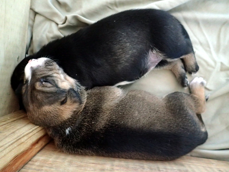 Bandit in the middle, Sable on top of himKP brought the dogs chew sticks. We didn’t think about how hard it would be for Frito to hold hers in her front PAW so KP held it for awhile, then I did. Frito thoroughly enjoyed it. She also enjoyed the beef jerky she stole out of KP’s suitcase. Damn potlicker dogs!2 week old acrobats, Sable and BanditUnfortunately their poop blends in nicely with the floorLots of puppy breath tooIt seems like these two are always together, it’s really cool because they are going to be together when they get adopted.I covered them up, so sweet!poserConvention at the boobsHighway meeting his Niece and NephewsLola decides to climb on inFrito didn’t even care. I thought she would rip their lips off.Eyes are open but they still can’t see.smelling each otherMosh pitbusting outWe love this guy, a little too much.Rob holding Bandit. They came to visit and kept switching puppies.I think Lisa dressed to match Sable.Bandit in his daddy’s arms.