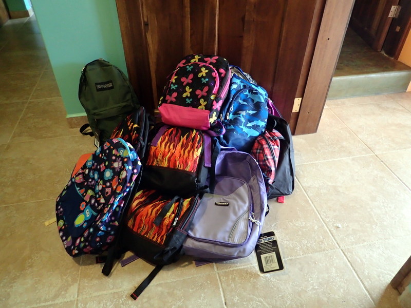 A bag of pencil sharpenersLeaning tower of crayonsPencils, notebooks, rulers, erasersColored pencilsnew backpacksConstruction paper and water colors, toothbrushes, kleenexover 50 glue sticksWe emptied the backpacks, sorted the stuff, then put one of pretty much everything in each pack. We had so much stuff left over that will be given to teachers.