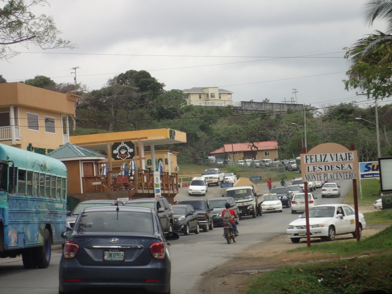 House on the Bahia road. The water/shoreline is not very far behind these homes.StoreBrightly painted buildingstraffic jam on the Bahia Rd.Traffic jam headed east into Las Fuertes, glad we were going the other way.